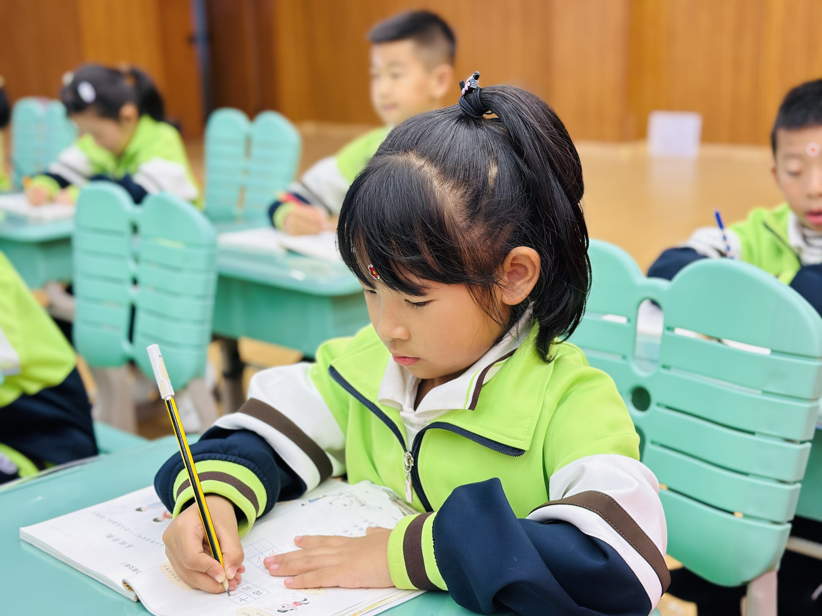 “一拳一尺一寸”,老师常说的话,孩子们都记在了心里。写字时,脊背挺得笔直,脑袋不歪不斜,握笔的小手姿势标准;读书时,书本轻轻翻开,目光紧盯文字,他们用最认真的姿势,守护着学习里的“小严谨”。这端正的模样,比任何奖励都动人。