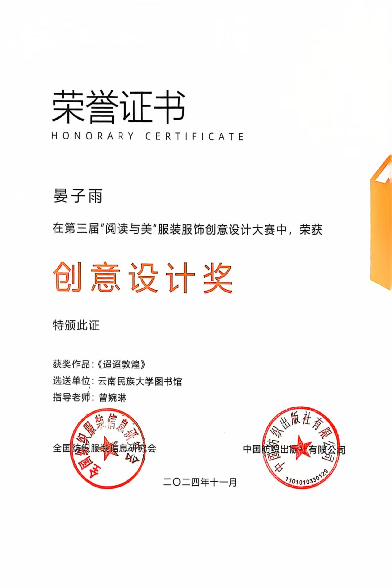 ▲晏子雨获第三届“阅读与美”服装服饰创意设计大赛创意设计奖