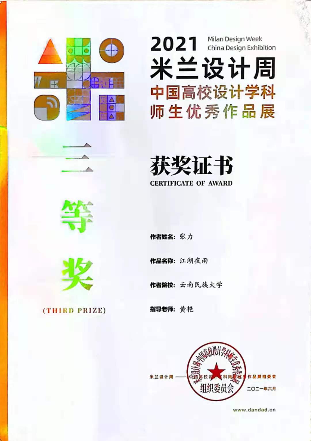 ▲张力获2021米兰设计周中国高校设计学科师生优秀作品展三等奖