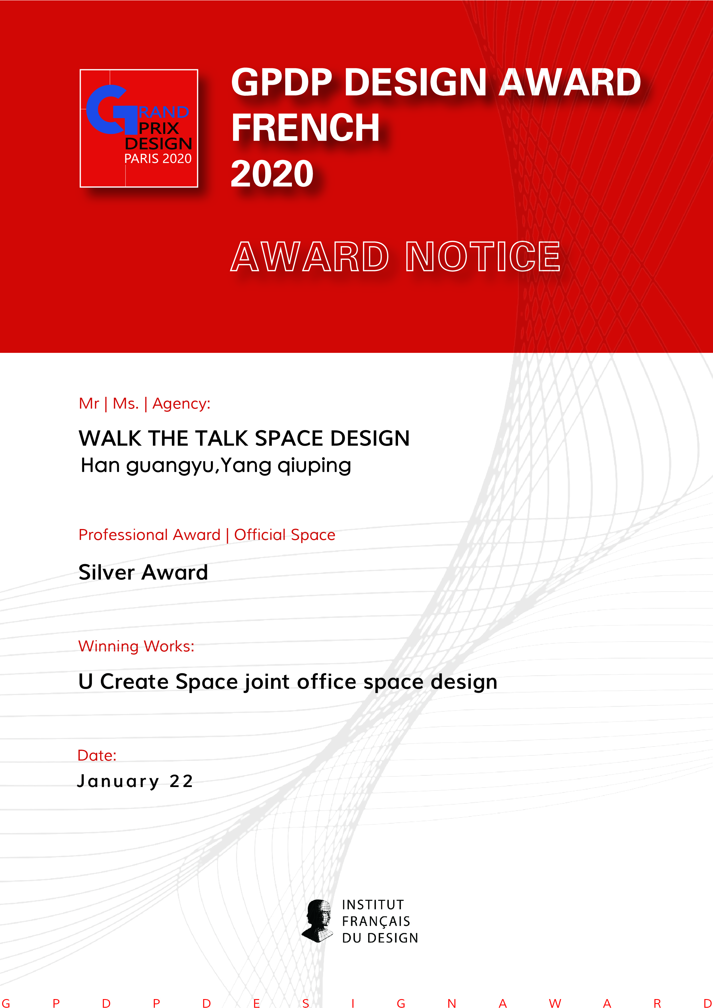 ▲2020年法国双面神“GPDP AWARD”国际设计大赛银奖(滇池时代办公空间视觉设计)荣誉证书