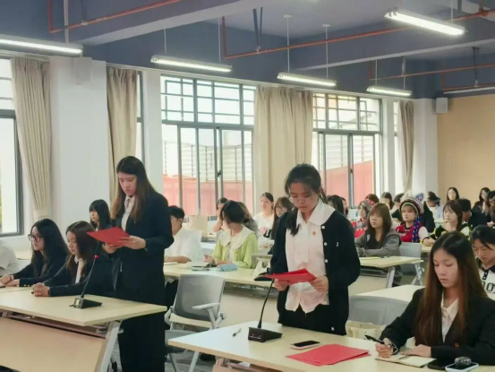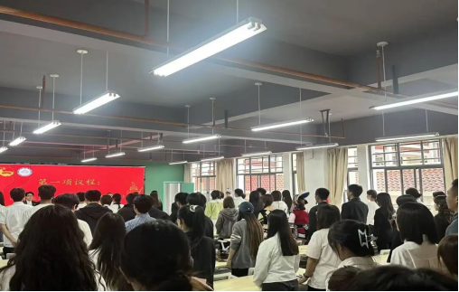 大会在庄严的中华人民共和国国歌声中正式拉开帷幕。全场代表肃立致敬,激昂的旋律回荡在报告厅内,尽显设计学院青年学子的爱国情怀与责任担当。