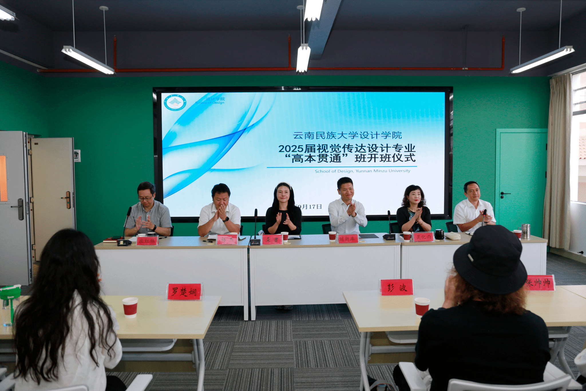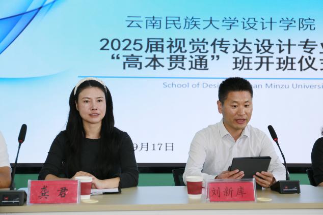 2025年9月17日上午,云南民族大学设计学院与云南轻纺职业学院艺术设计学院联合举办的2025级视觉传达设计专业“高本贯通”班开班仪式在云南民族大学设计学院多功能报告厅举行。两院领导、教师代表及48名新生共同参加了仪式。