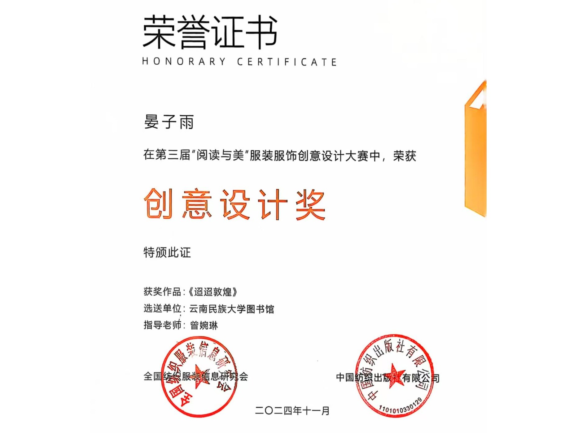 ▲晏子雨获第三届“阅读与美”服装服饰创意设计大赛创意设计奖