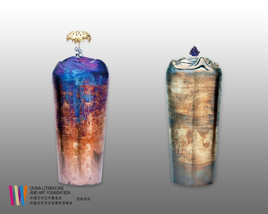 《风物颂—泼水节、火把节》金属工艺系列创作,造型上借鉴古滇青铜文化中的桶形贮贝器,以起伏相叠的山峦形态造势,表现出造型的简雅与端庄。水瓶顶部吉象加水柱,装饰纹样表现傣族女祈撒“圣水”,佤族男女木鼓舞,傣族象脚鼓舞,壮族、藏族、阿昌族、布朗族、德昂族男女泼水等。火瓶主纹分为前后两个装饰带,前景为彝族、白族、哈尼族、基诺族、拉祜族、纳西族、普米族、傈僳族等围着巨大的篝火打歌,后景是凤凰、日月、山石、流云与星空。...