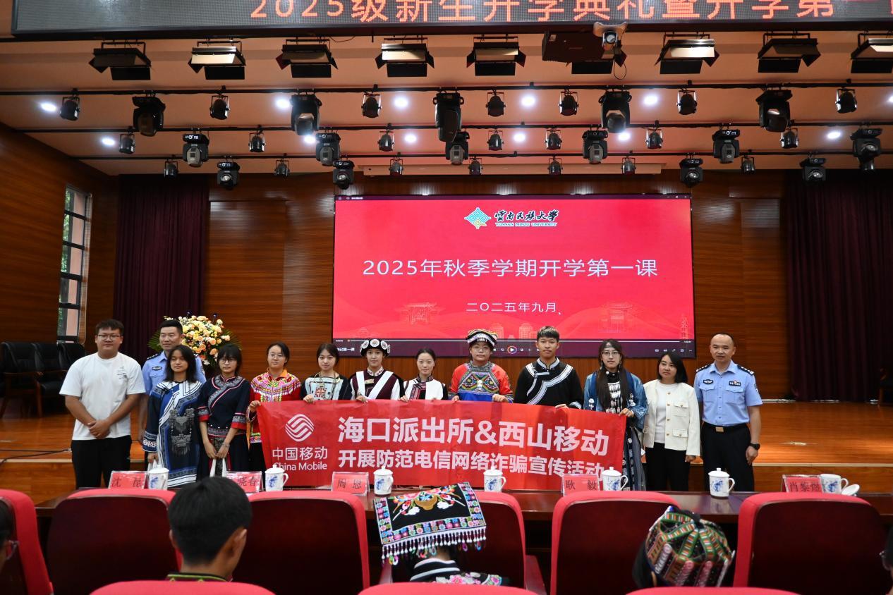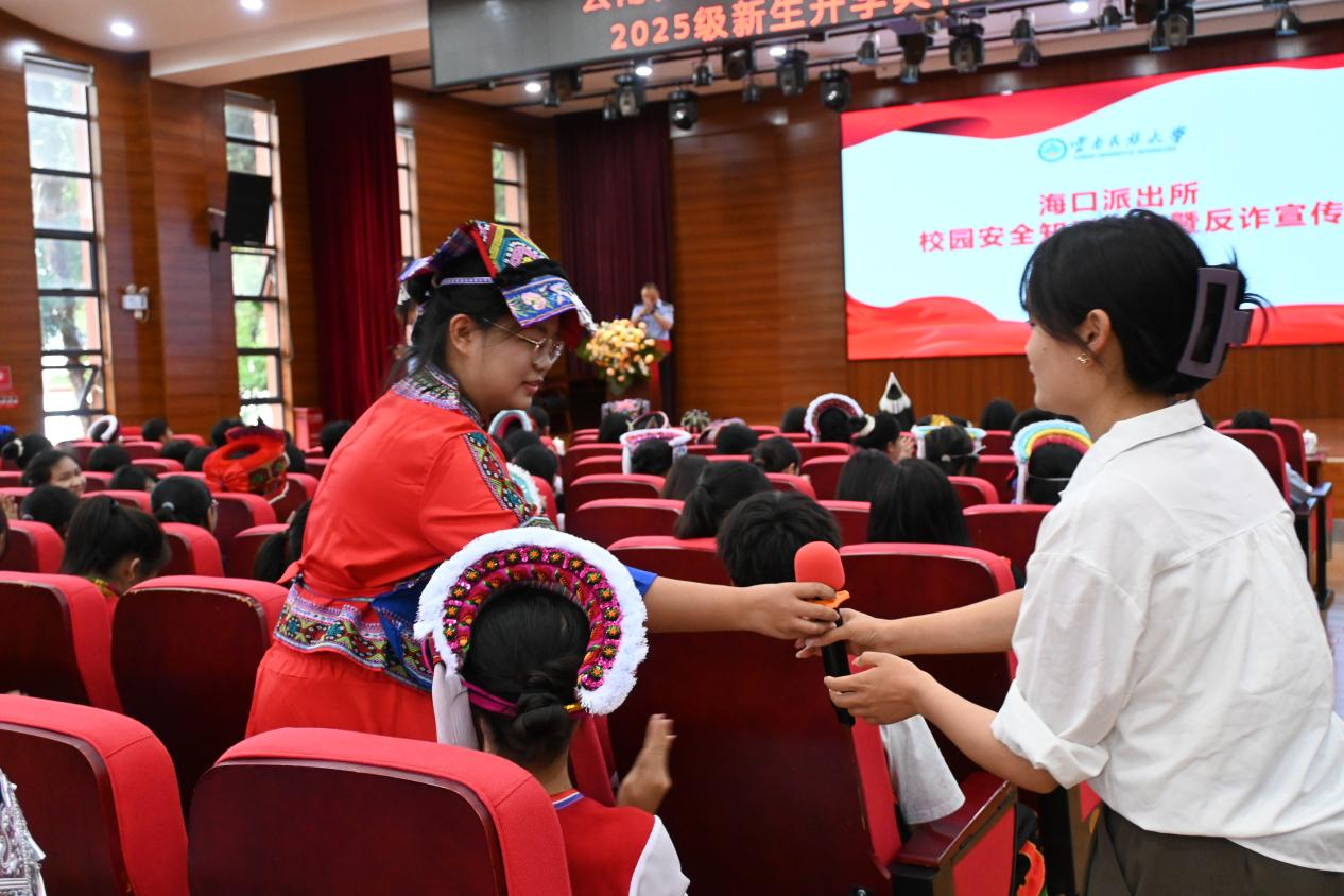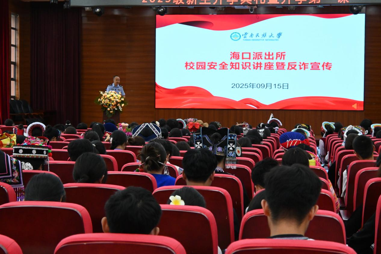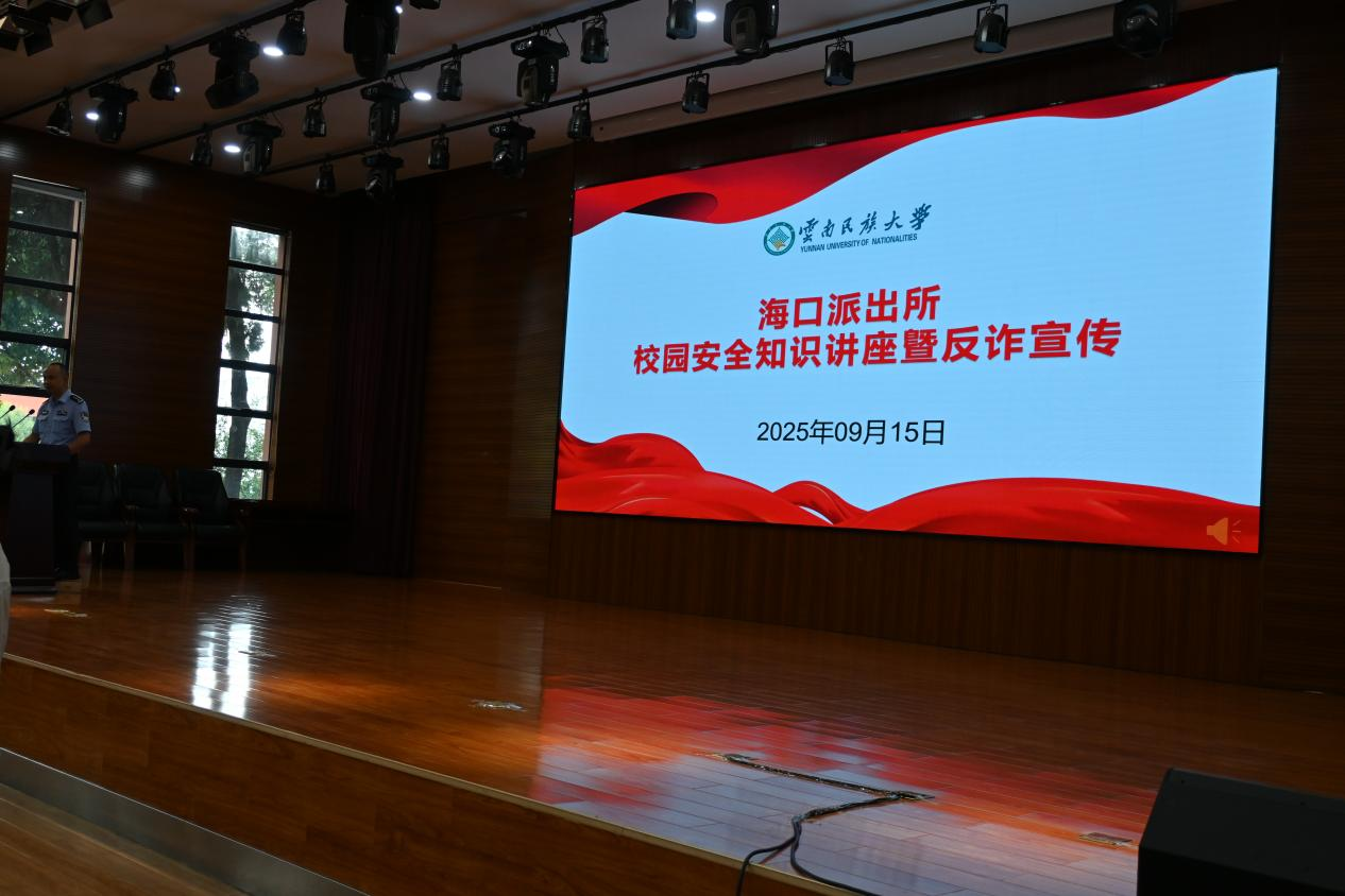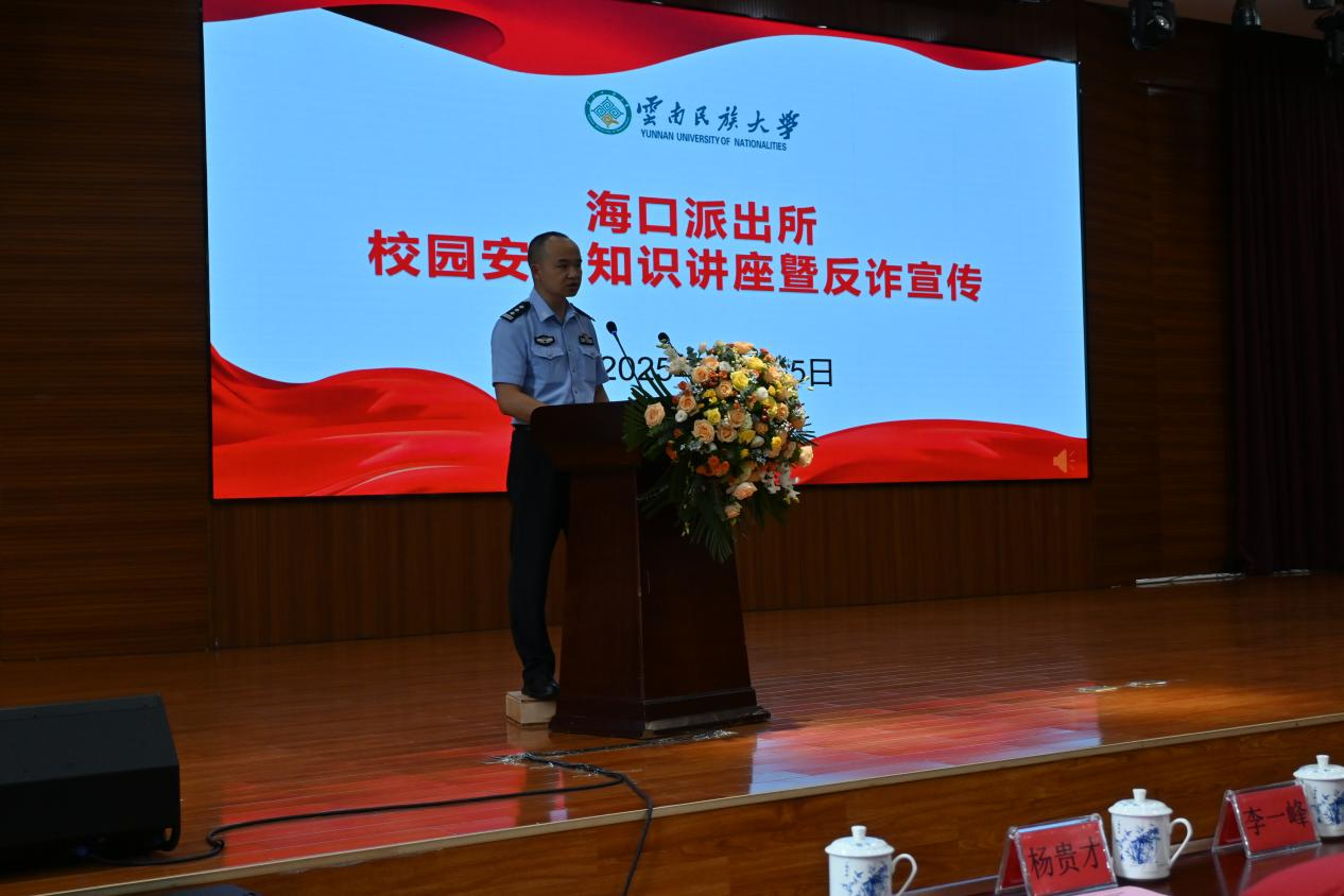 近年来网络电信诈骗案件(包括电话、电信、网络、淘宝网刷信誉等)多发,诈骗分子无孔不入,利用多种途径进行诈骗。大学生是诈骗分子行骗的主要对象之一,部分大学生安全防范意识薄弱,为维护良好的学习环境,提升大学生安全防范意识,学会保护自己,掌握防诈骗技巧,共同营造一个和谐美好的校园环境。2025年9月15日下午,海口街道派出所王晓春所长、沈昆副所长、杨贵才民警到云南民族大学海口校区明汇楼一楼报告厅开展2025级校园安全知识讲座暨防诈宣传教育活动。本次活动采取线上线下相结合的方式开展,全院3200余名师生参与。