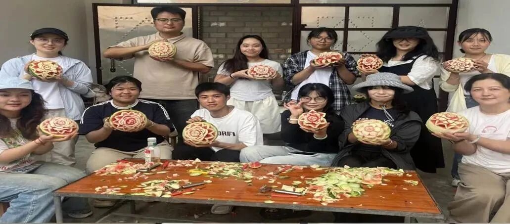 调研期间,调研组成员还专门体验了当地的非遗文化——剪纸和果雕。在非遗老师的悉心指导下,师生亲身感受到了这项传统技艺的魅力。非遗老师介绍,为了推动剪纸果雕的活态传承,他们开设培训班,将其融入乡村旅游体验项目,通过多种途径让这项古老的非遗技艺在新时代重新焕发活力,成为乡村文化振兴的重要载体。