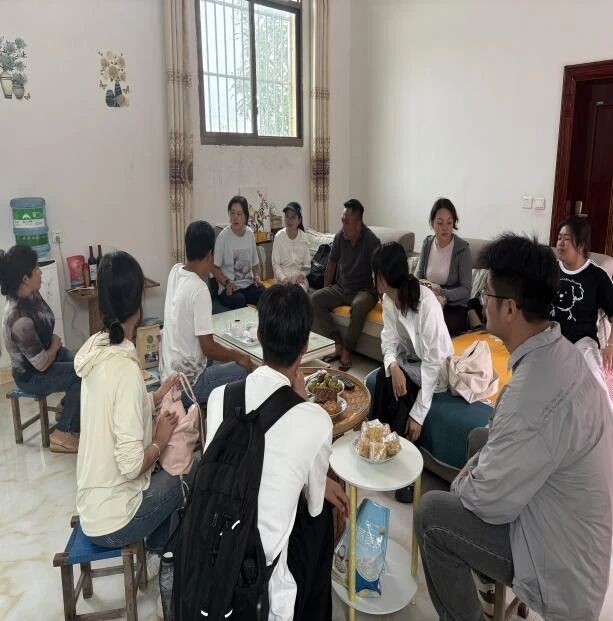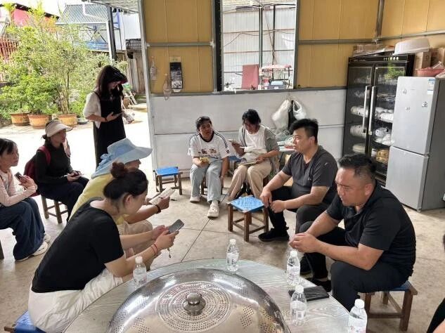 抵达那目寨的第一天,调研组师生与那目村村委会成员及驻村工作队员座谈交流。党总支书记刀岩团旺回顾了那目村从传统傣寨到现代乡村的变迁历程,介绍了以水稻种植、腌菜膏加工、大米加工为主的特色产业体系,以及工业园区对当地经济的带动作用。之后,双方围绕特色产业升级、非遗活态传承、跨境婚姻家庭融入等议题展开深入交流,为后续调研锚定了方向。