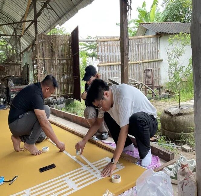 关注民间手工艺传承发展的成员专程拜访朗主任父子,探寻傣族手工艺的传承脉络。朗主任家族世代传承傣族传统绘画技艺,祖辈为村寨寺庙绘壁画、为傣家竹楼饰门楣梁柱,是当地出了名的“画匠世家”。郎主任向调查组展示了百年傣画手稿及祖传矿物颜料、雕花画笔,讲解“水纹”“贝叶纹”等图案蕴含的文化内涵。为将传统技艺传承下去,朗主任创新傣绘形式,把老画纹样复刻到水泥雕上,做成摆件、小品,让老手艺跟上新时代,使“小传统”衔接“大传统”。同学们体验水泥雕基础塑形,在主任指导下勾勒传统纹样,感受傣族手工艺在变迁中的传承与创新。